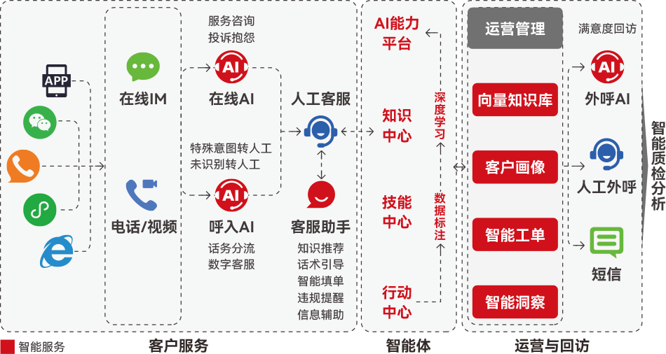 端到端 AI 深度渗透呼入、外呼、质检、工单等全部场景。